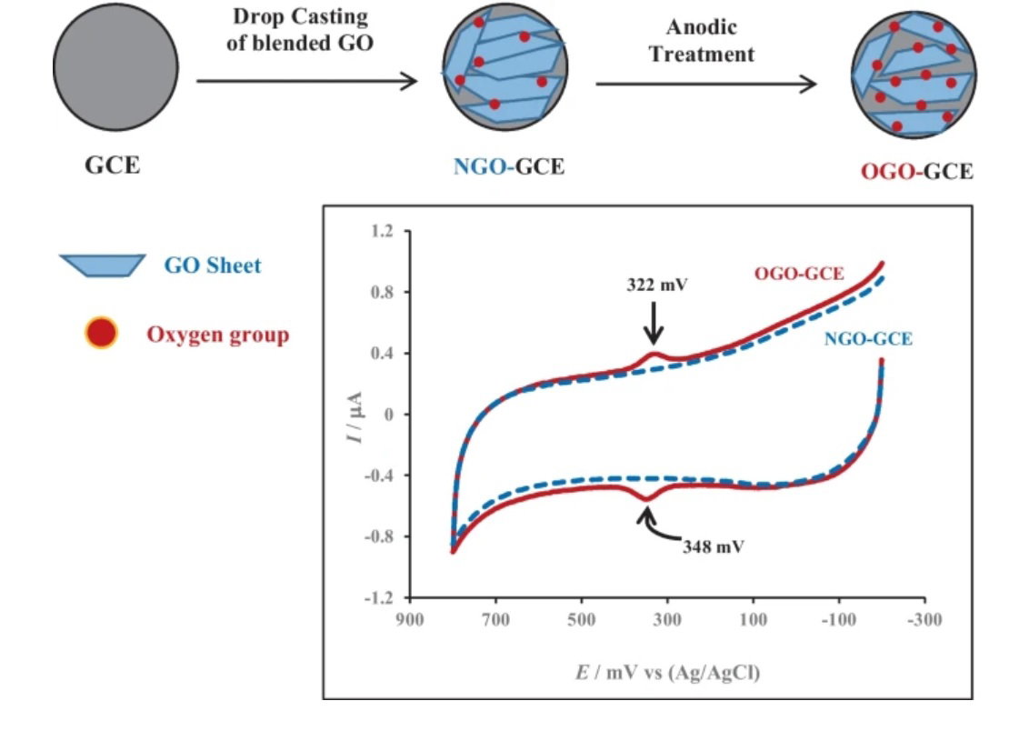 A native graphene oxide (GO) prepared by Hummers’ modified method was used as the template materials for the fabrication of electrochemically oxidative graphene oxide (OGO). The fabrication of OGO onto the glassy carbon electrode (GCE) persuaded via anodic reversible voltammetric cycles of a previously GO-GCE base surface materials. The new adapted approach was simple, cost-effective, and competent for producing active materials by preferential grafting of oxygenated functional groups into the GO lattice. It improved the rate of electron transfer process due to decreasing the contextual stacking among GO layers. The structure, composition, and the reactivity of the prepared OGO were characterized using various analytical techniques. FTIR data signified the richness of OGO surface with oxygenated functionalities including epoxy, ketonic, and carboxylic groups. The SEM images concluded a softer and smoother OGO surface, while the EDS analysis determines the significant differential amount of oxygen in OGO. XPS data confirmed the presence of a new oxygenated peak (not detected in the native GO) assigned to the aldehyde/alcoholic functional group. Cyclic voltammetric (CV) analysis of OGO-GCE in the background electrolyte indicated the existence of a couple reversible redox peaks. Differential pulse voltammetry (DPV) results were evident for the promising efficiency of OGO-GCE on the simultaneous determination of biological and environmental species such as dopamine (DA), ascorbic acid (AA), uric acid (UA), hydroquinone (HQ), and catechol (CC), respectively.